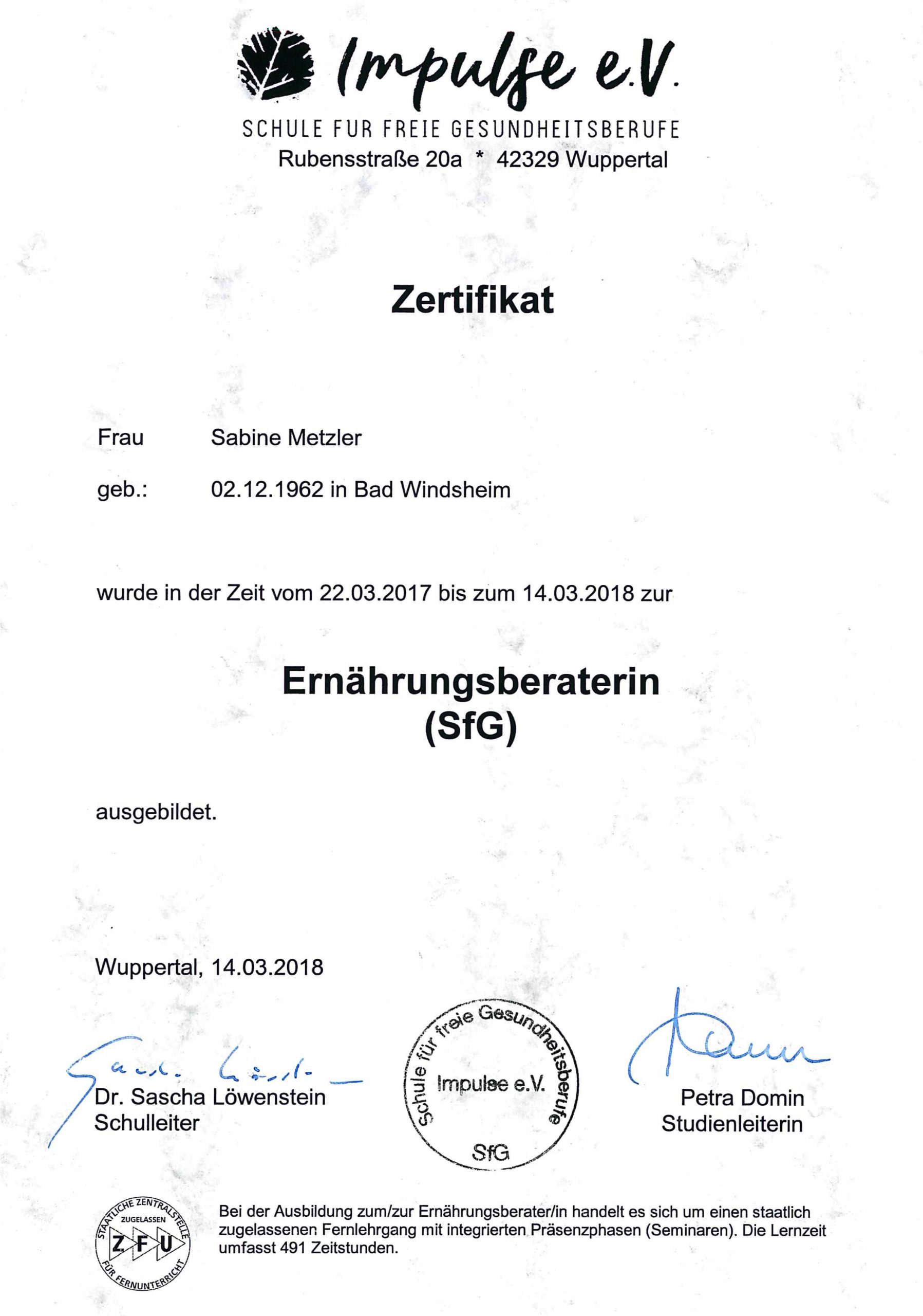 Meine Ausbildung orientierte sich nach den Grundsätzen der Deutschen Gesellschaft für Ernährung (DGE). Ich bilde mich ständig weiter und verfolge dabei einen ganzheitlichen Ansatz, wobei mir die Heilpraktiker-Ausbildung sehr zugute kommt.